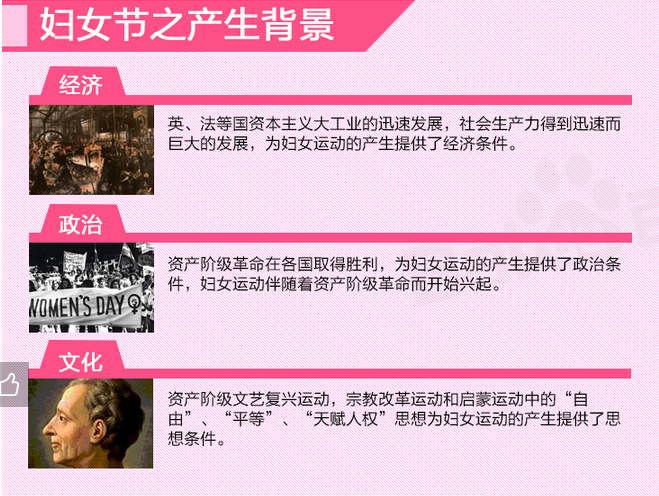 女節(jié)”、“三八節(jié)”和“三八婦女節(jié)”。是在每年的3月8日為慶祝婦女在經(jīng)濟(jì)、政治和社會(huì)等領(lǐng)域做出的重要貢獻(xiàn)和取得的巨大成就而設(shè)立的節(jié)日。