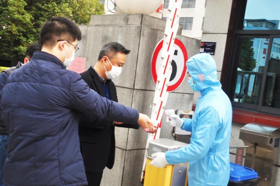 (圖為企業(yè)疫情防控小組成員在為來訪領(lǐng)導測量體溫)