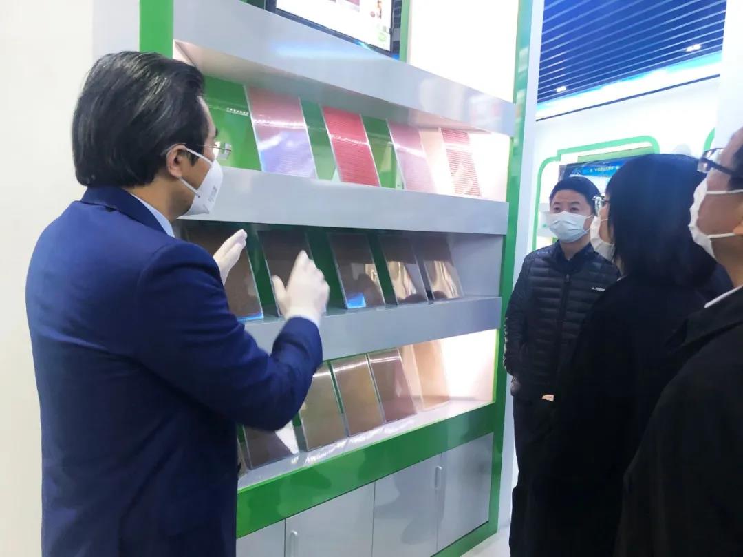(圖為邵亞國為來訪領(lǐng)導介紹高端SMC片材及模壓制品)
